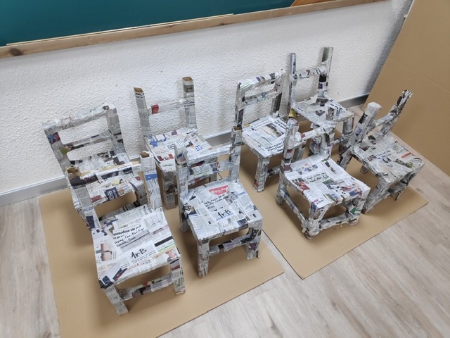 Coincidint amb l’inici de la Unitat Didàctica en què parlem dels materials: la fusta i el paper, hem realitzat un projecte de construcció d’una petita cadira. Hem practicat el treball cooperatiu i ens hem adonat de la resistència i el pes que pot arribar a suportar una estructura de cartró reforçada amb pasta de paper.