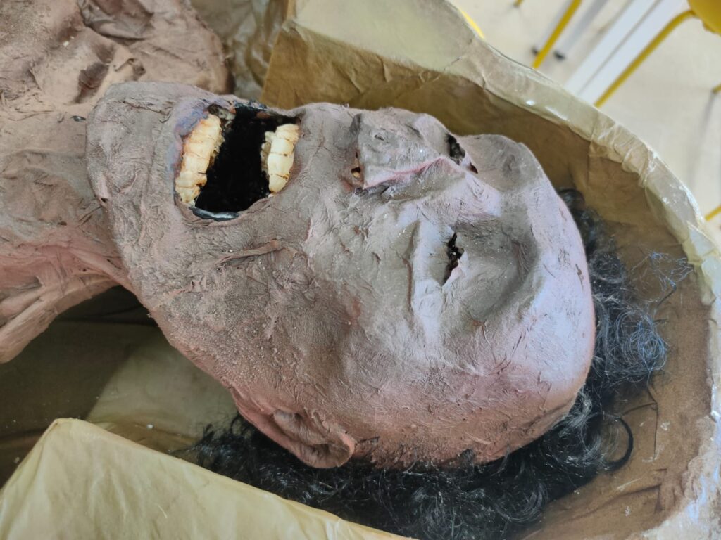 Durant l’hora d’optativa, vam trobar uns papers de compra i venda d’antiguitats egípcies que ens van portar fins a una cambra “secreta” situada sota les escales del col·legi. Allà, amb llanternes a la mà, vam descobrir un sarcòfag blanc, sense nom, que contenia un cadàver. El vam extreure i transportar al laboratori com si fóssim autèntics arqueòlegs.